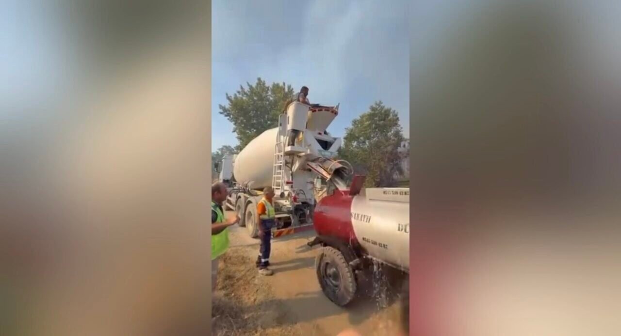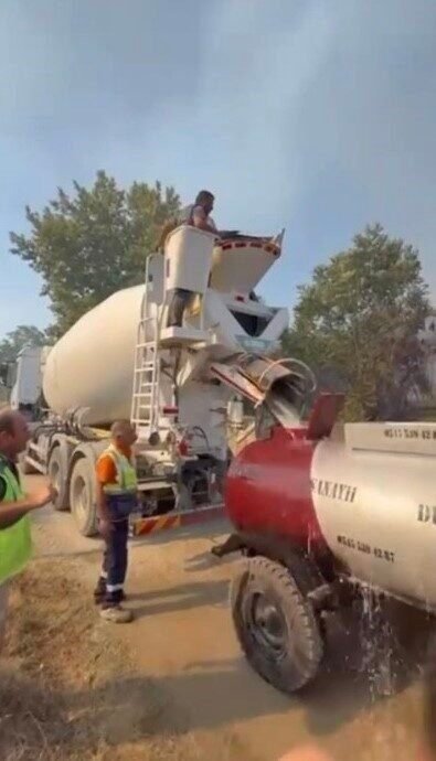 Beton mikserleri ve iş makineleri ile yangını söndürmek için seferber oldular