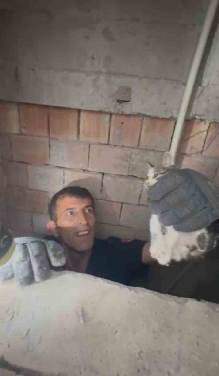 Hatay’da apartmanın havalandırma boşluğuna düşen yavru kedi itfaiye ekiplerince kurtarıldı.