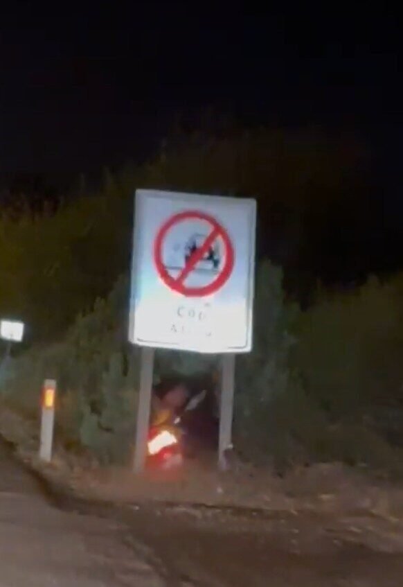 Diğer taraftan motosiklet sürücüsünün dörtlü sinyal lambalarını yakıp yolda uzun süre şerit değiştirerek ilerlediği, trafik güvenliğini tehlikeye düşürdüğü ve tabelaya çarpma anı aynı istikamette seyir halindeki bir otomobildekiler tarafından cep telefonuna kaydedildi.