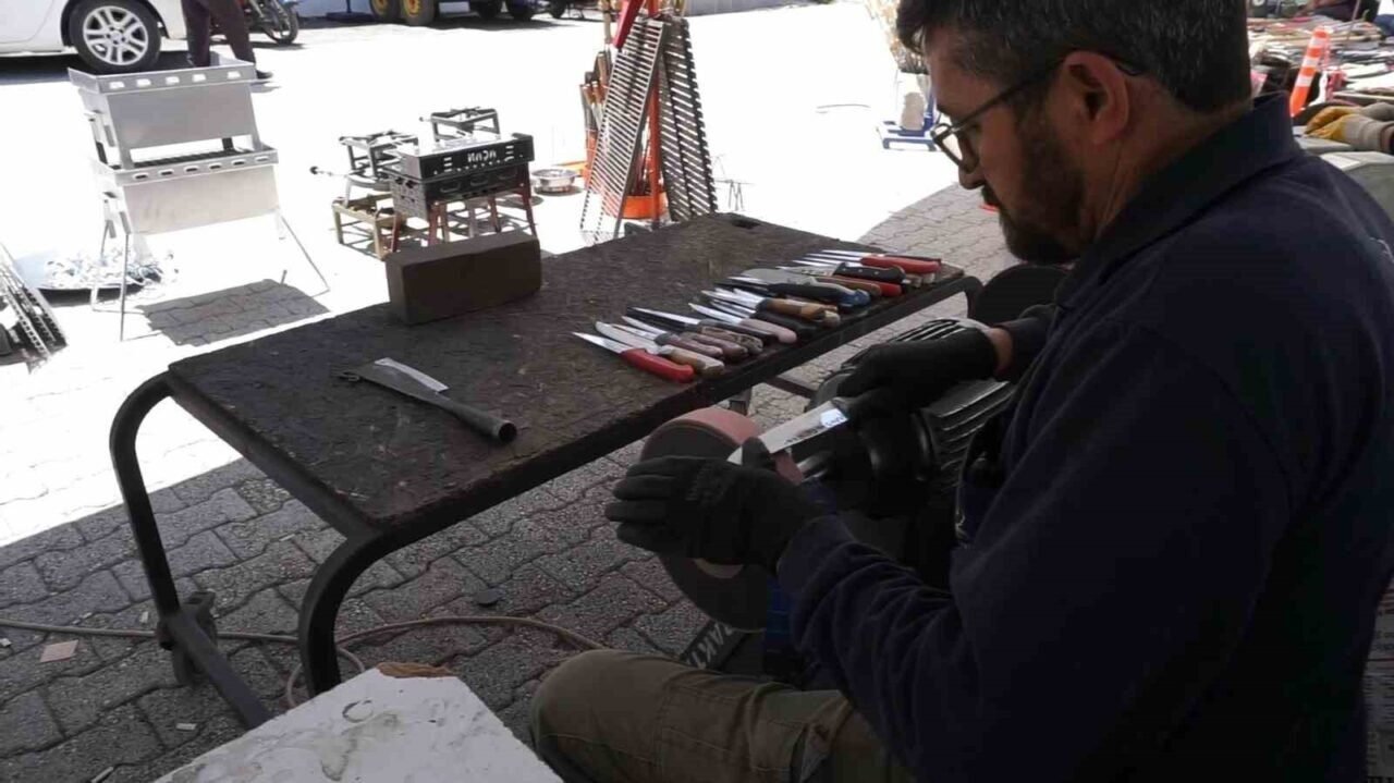 Bayram öncesi kurbanlık hayvanların seçimi, pazarlıklar ve alışverişler tüm hızıyla sürerken, kurban kesiminin en önemli unsurlarından biri olan bıçakların hazırlığı da büyük önem kazanıyor. Özellikle keskin bıçakların, kurbanın hem kolay hem de sağlıklı bir şekilde kesilmesinde rolü büyük oluyor. Bu nedenle her yıl Kurban Bayramı öncesi Gölhisar Cumhuriyet Meydanı’nda kurulan bıçak bileme tezgahları, vatandaşların yoğun ilgisini çekiyor.