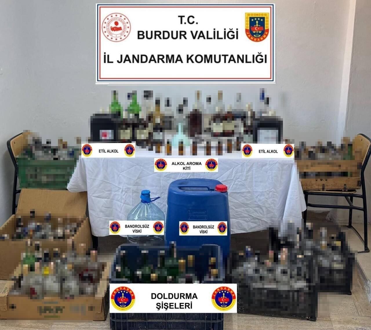 BURDUR’DA JANDARMA EKİPLERİ TARAFINDAN DÜZENLENEN OPERASYONDA ÇOK SAYIDA ALKOL YAPIMINDA KULLANILAN MADDE VE LİTRELERCE EL YAPIMI ALKOL ELE GEÇİRİLİRKEN 7 ŞAHIS GÖZALTINA ALINDI.