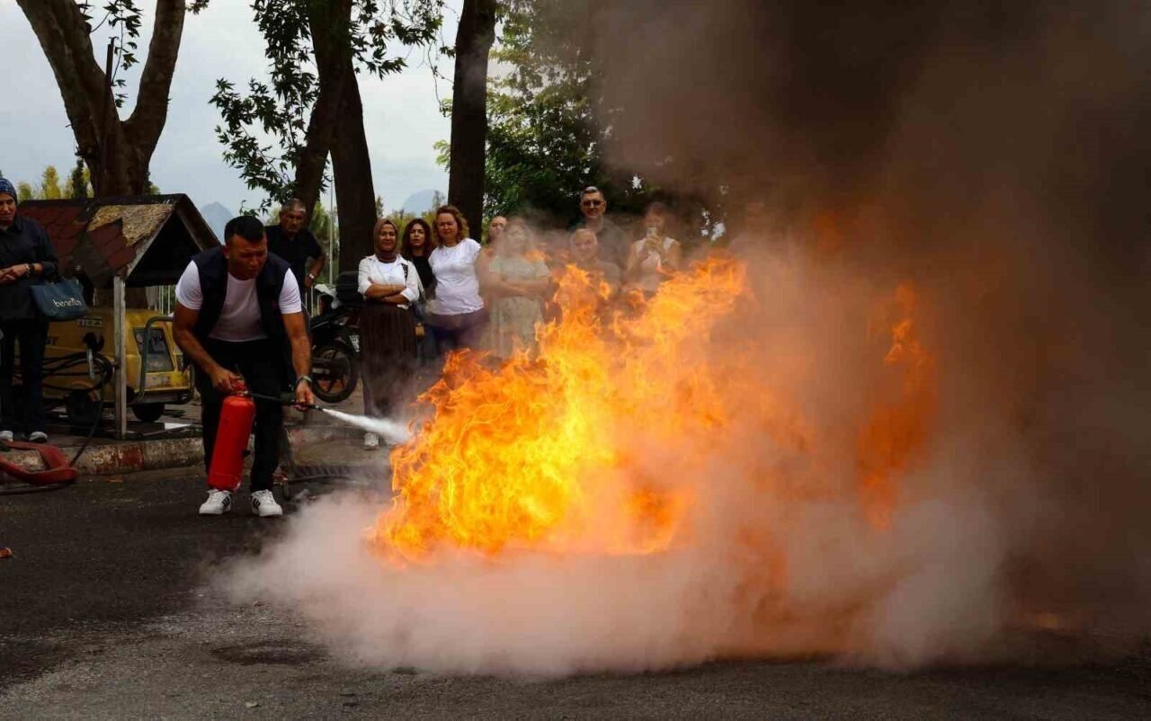 Antalya Büyükşehir Belediyesi İtfaiye Daire Başkanlığı, kurum içi iş güvenliği tedbirleri kapsamında belediye personeline yönelik yangın eğitimlerini sürdürüyor. Eğitimlerde yangınların nedenleri, acil durum müdahaleleri ve tahliye yöntemleri teorik olarak anlatılırken, uygulamalı yangın söndürme tatbikatları ile bilgiler pratiğe dökülüyor.