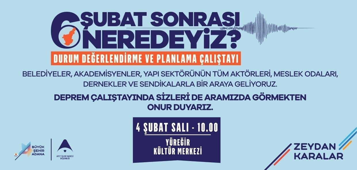 ADANA BÜYÜKŞEHİR BELEDİYESİ, 6 ŞUBAT DEPREMLERİNİN YILDÖNÜMÜ NEDENİYLE “DEPREM ÇALIŞTAYI” DÜZENLEYECEK. 6 ŞUBAT SONRASI NEREDEYİZ? DURUM DEĞERLENDİRME VE PLANLAMA ÇALIŞTAYI İLE SONUÇ RAPORU VE DEPREM DEĞERLENDİRME FORUMU 4 ŞUBAT SALI GÜNÜ GERÇEKLEŞTİRİLECEK.