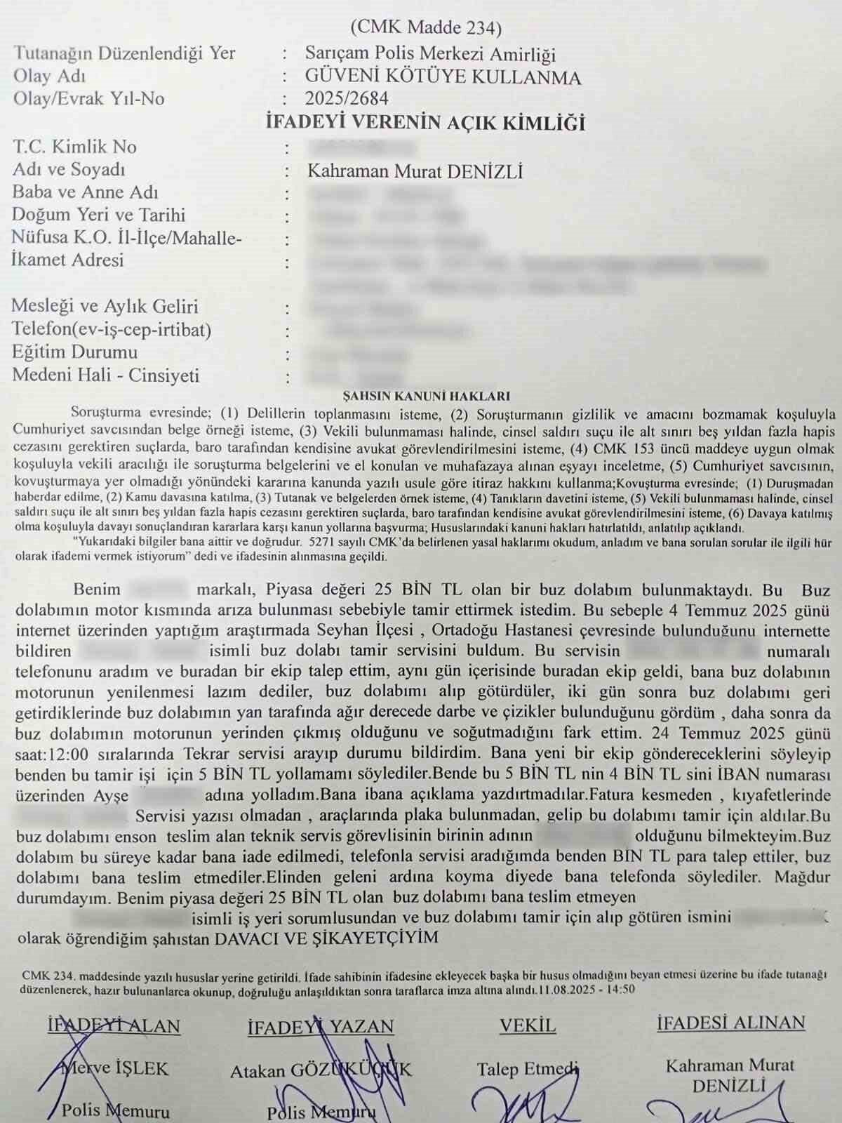 Merkez Sarıçam ilçesi Çarkıpare Mahallesi’nde oturan Kahraman Murat Denizli, buzdolabının arızalanması üzerine 4 Temmuz’da internetten bulduğu bir teknik servise kayıt oluşturdu. Teknik servis elemanları ise geldiğinde, ’buzdolabının motoru arızalanmış, 5 bin liraya tamir ederiz’ dedi. Bunun üzerine Denizli, teknik servise dolabını gönderdi. Birkaç gün sonra dolap geldiğinde arızanın devam ettiğini fark eden Denizli, yeniden teknik servisi çağırdı.