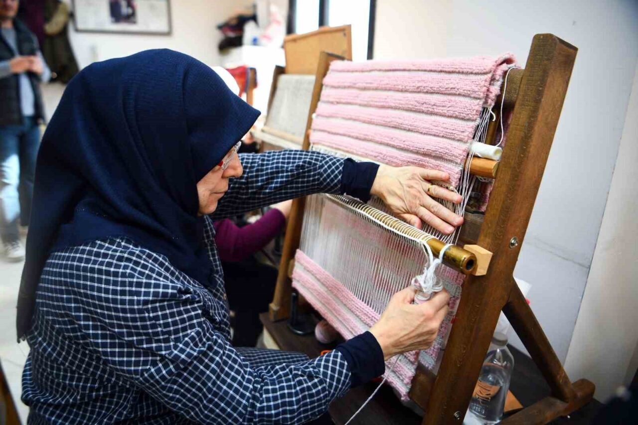 Çukurova Belediyesi Tesisler Müdürlüğü’nün Atatürk Kadın Yaşam Köyü’nde açtığı kilim dokuma