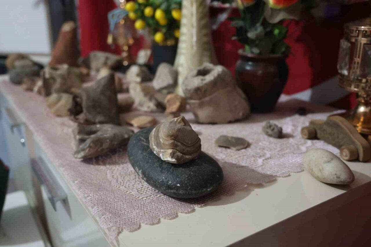 Dağlarda çobanlık yaparken ilgisini çeken taşları toplayıp evinde sergileyen Mehmet Kızgın, “Doğada ilgimi çeken taşları topluyorum ve koleksiyon yapıyorum. Doğa ve hayvanları sevdiğim için 2017 yılından beri taş topluyorum. Topladığım bütün taşları eve getiriyorum. Mesela bu soku taşı eve getirdiğim ilk taştır. Bu taşla eskiden insanlar buğday döverlermiş. Sonra fosil taşı bulup getirdim. Bu taşları getirip koleksiyon yapıp sergiliyorum ve hala da topluyorum. Benim için bu taşlar eskiye dayalı tarihi taşlardır. Doğayla iç içe olduğum için hepsini toplayıp eve getiriyorum. Taşların değeri var mıdır, yok mudur diye hiç bakmadım. Evime her gelen misafir taş koleksiyonumu görünce çok beğeniyorlar. Misafirler taşları gördüğünde çok şaşırıyorlar ne güzel taşlar diye söyleyip duruyorlar. Bugün yağmurlu olduğun için daha çıkamadım ama çıktığım zamanlar yine toplamaya devam edeceğim” ifadelerini kullandı.