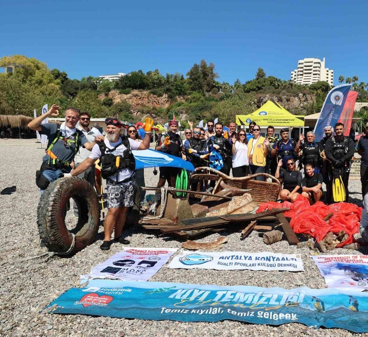 Antalya Büyükşehir Belediyesi ve TURMEPA işbirliği ile çevre bilincini artırmak ve deniz kirliliğine dikkat çekmek amacıyla Uluslararası Kıyı Temizleme Günü kapsamında Konyaaltı Varyant Ekdağ 1 No’lu Plajı önünde deniz ve kıyı temizliği etkinliği düzenlendi. Birçok ülkede binlerce gönüllünün katılımıyla eş zamanlı olarak başlayan etkinliklere Antalya’da da yoğun ilgi gösterildi. Antalya Büyükşehir Belediyesi Başkan Vekili Büşra Özdemir, kamu kurum temsilcileri, su sporları kulüpleri, dalgıçlar, STK’lar, ve gönüllülerle birlikte kıyı temizliğine destek verdi.