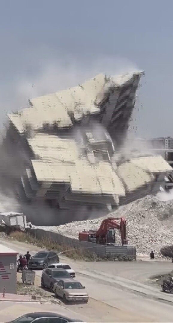Hatay’ın Antakya ilçesinde 12 katlı binanın iş makinesinin darbesiyle yıkımı vatandaşlara deprem etkisi yaşattı. Kontrollü olarak yıkılan binanın yerle bir olduğu anlar kameraya yansıdı.
