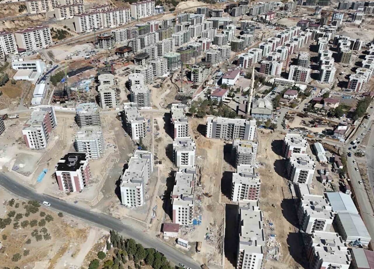Kahramanmaraş merkezli meydana gelen depremler sonrası Doğukent Mahallesi’nde yapımı süren 28 bloktan oluşan 424 konut ve 42 ticari alanda çalışmalar hızla devam ediyor.