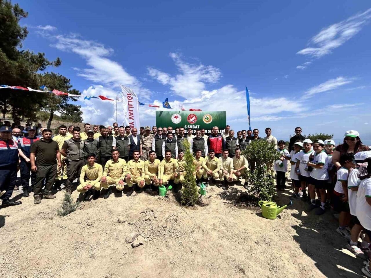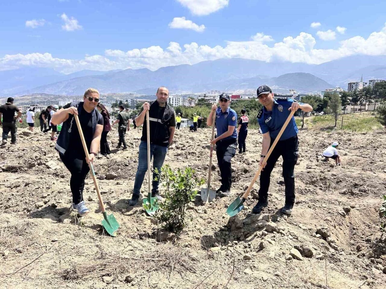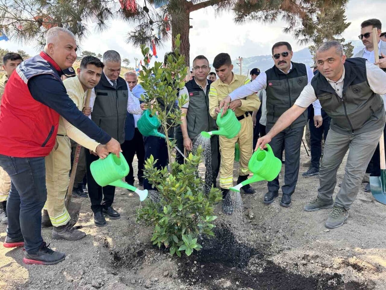 Konuşmanın ardından Vali Masatlı, Hatay Orman Bölge Müdürü İlkay Günay, protokol üyeleri ve öğrenciler, toprakla buluşturulan fidanlara can suyu verdi.