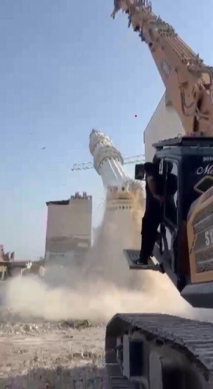 Hatay’ın Kırıkhan ilçesinde depremde ağır hasar alan minarenin, iş makinesinin darbesiyle yerle bir olduğu anlar kameraya yansıdı.
