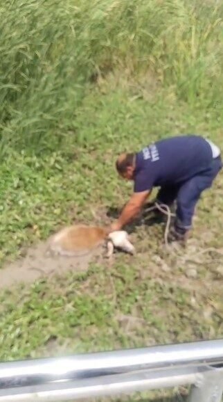 Derede çamura saplanan koyunu itfaiye ekipleri kurtardı