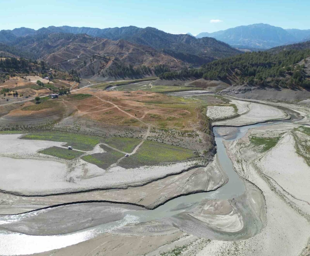 Kahramanmaraş’ta sıcak yaz mevsimi ve yağışların azlığı nedeniyle Menzelet Barajı’ndaki kuraklığın boyutu dron kamerasıyla görüntülendi. Suların çekildiği alanda yöre sakinlerinin ortaya çıkan arazide üretim yapması dikkat çekti.