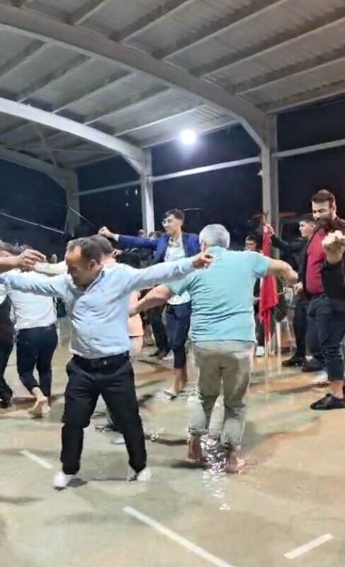 Cep telefonu ile kaydedilen görüntülerde, gelin ve damadın su dolu pistte paçaları sıvamış davetlilerle birlikte eğlenceye devam ettiği görüntüler yer aldı. Bazı misafirler ise sandalyelerin üzerine çıkarak sulardan korunmaya çalıştı. Organizasyon ekibi tarafından düğün alanında suların çekilmesiyle, yağışa rağmen müzik kesilmedi ve eğlence devam etti.