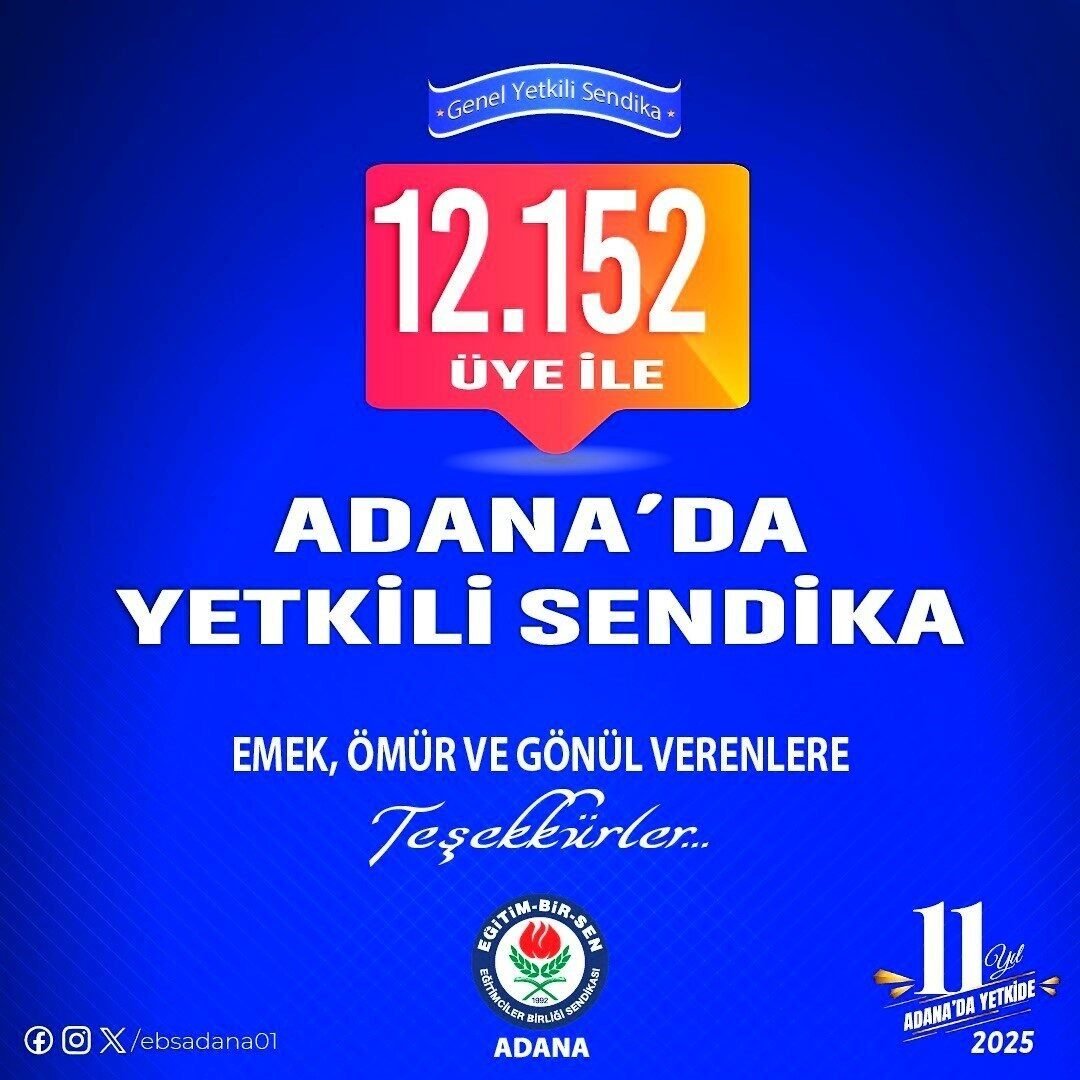 Eğitim-Bir-Sen Adana Şubesi, 2025 yılı mutabakatı sonuçlarına göre Eğitim-Öğretim ve Bilim Hizmetleri kolunda Adana’nın 15 ilçesinde yetkiyi perçinleyip, Çukurova’da yeniden yetkili sendika oldu. Konuyla ilgili bir açıklama yapan Şube Başkanı Mustafa Sarıgeçili; “Güç Birlikte, Zafer Bizimle düşüncesiyle mücadele ettik ve Adana’da ilk kez üye sayımız 12 bini aştı. 8 ayda sendikamıza 1531 yeni üye kazandırarak tarihî bir başarıya imza attık. Emeği geçen herkese teşekkür ediyorum” dedi.