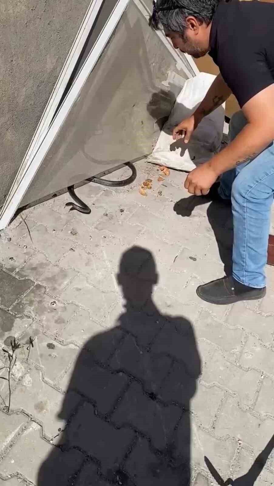 Hatay’ın Payas ilçesinde yaşayan ve bölgede “Yılancı Kemal” olarak tanınan Kemal Başer, eve giren 1 metrelik yılana parmağını kaptırdı. Yılan tarafından parmağı ısırılan Başer’in sakinliği dikkat çekerken, çevredeki vatandaşların korkusu kameraya yansıdı.