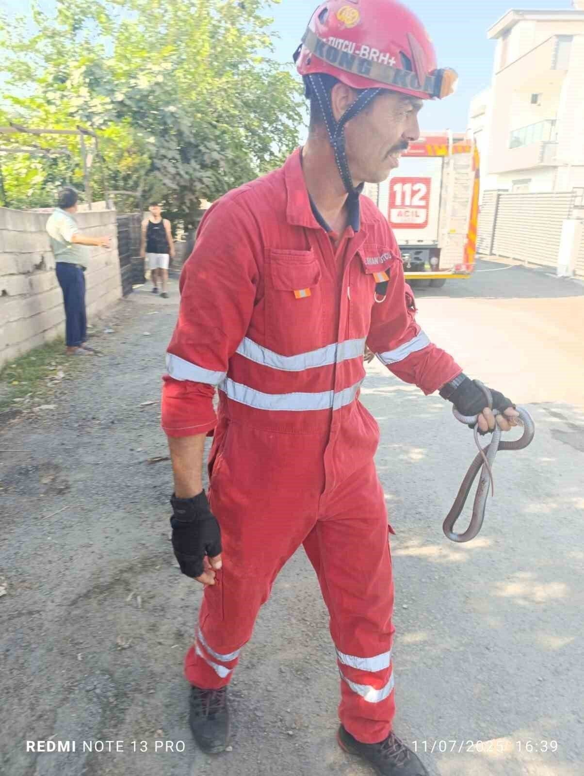 Hatay’ın Dörtyol ilçesinde bir eve giren yılan, özel bir aparatla itfaiye ekipleri tarafından yakalandı.