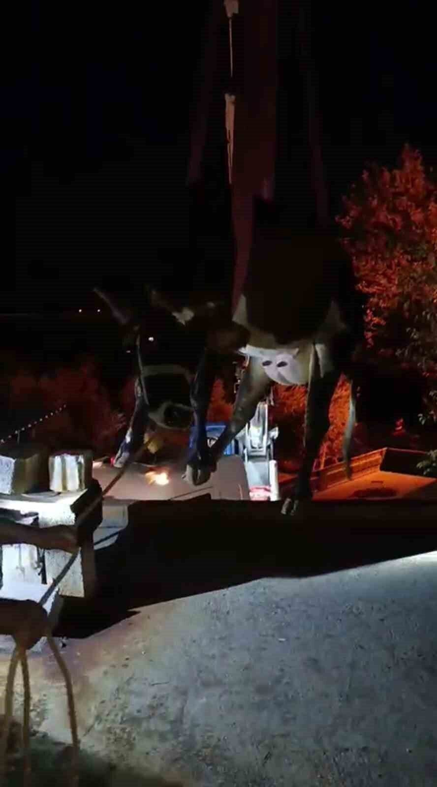 Hatay’da dama çıkarak mahsur kalan inek, itfaiye ekiplerinin operasyonuyla vinçle