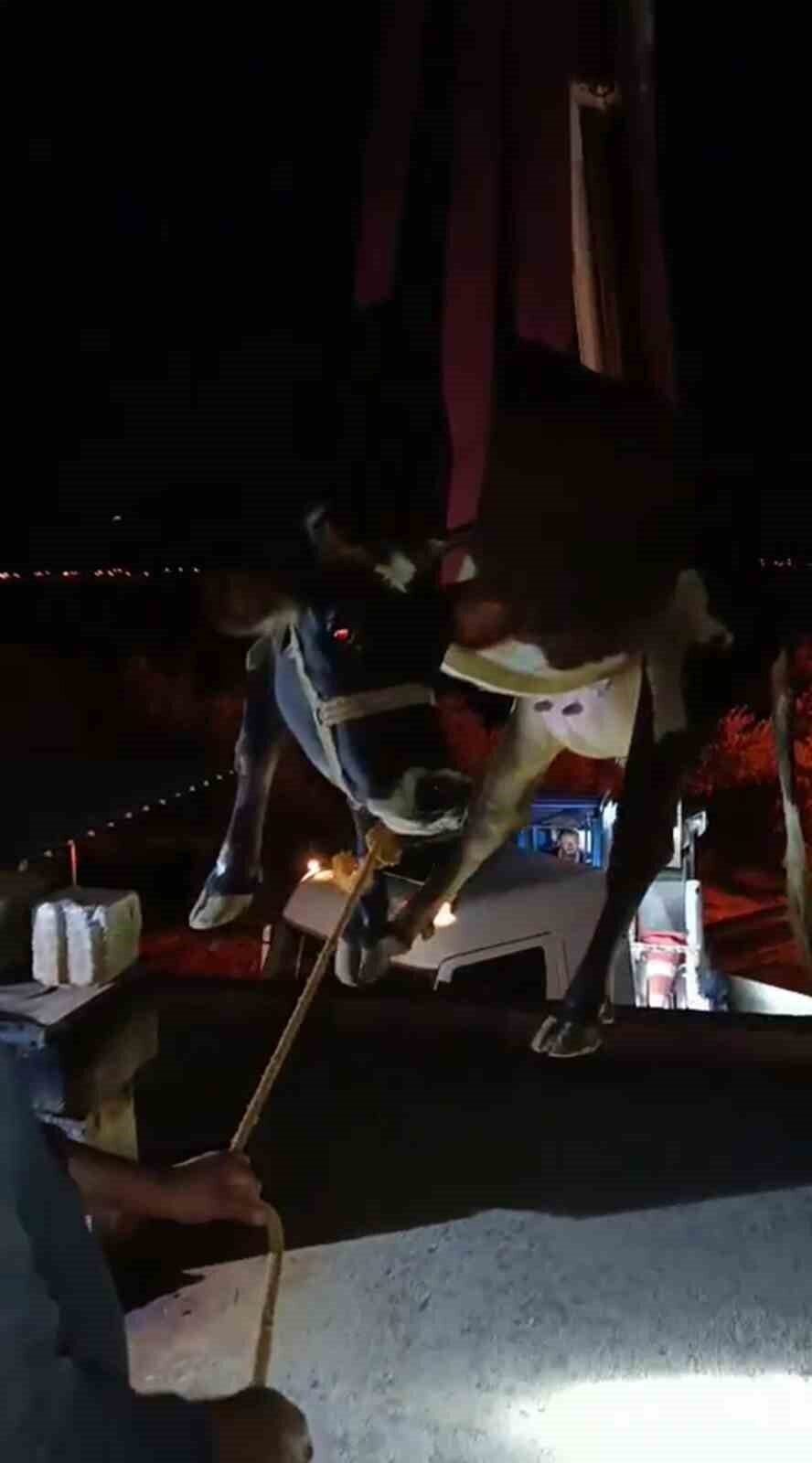 Hatay’da dama çıkarak mahsur kalan inek, itfaiye ekiplerinin operasyonuyla vinçle kurtarıldı.
