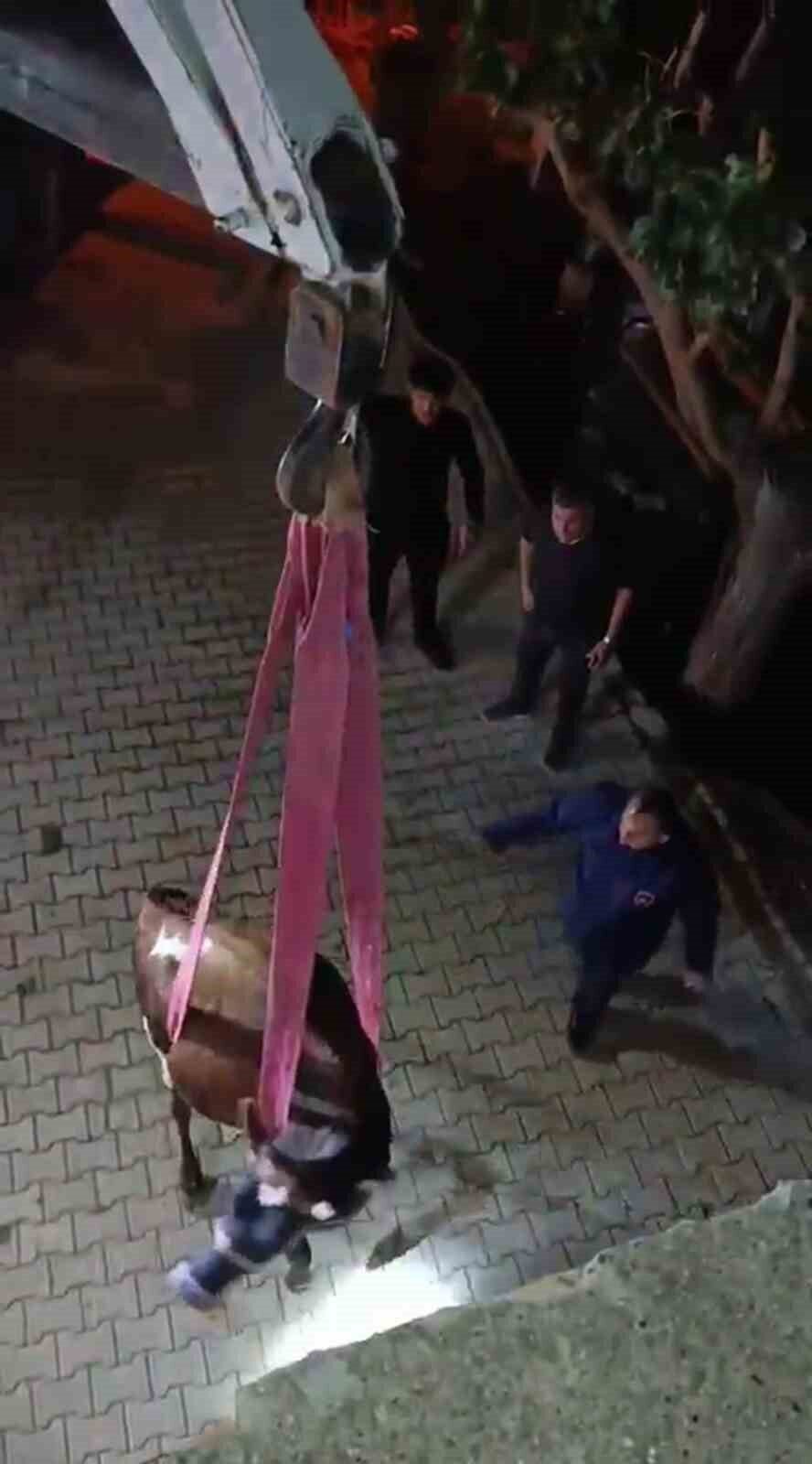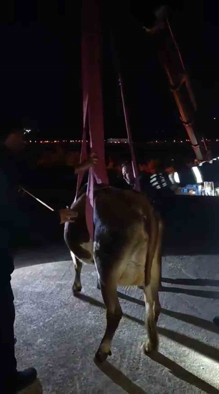 Hatay’da dama çıkarak mahsur kalan inek, itfaiye ekiplerinin operasyonuyla vinçle kurtarıldı.