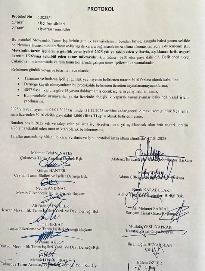 Konuyla ilgili Yüreğir Ziraat Odası Başkanı Mehmet Akın Doğan, İhlas Haber Ajansı’na açıklamalarda bulundu. Doğan, “Valimizin başkanlığında Tarım İl Müdürlüğü, ziraat odaları, aracılar ve işçiler olarak toplanıp protokol hazırlıyoruz. Bu anlaşmanın başlangıç tarihi 01.01.2025-31.12.2025 tarihine kadar fiyatlar belirleniyor. Ne zaman Cumhurbaşkanımız asgari ücrete zam yaparsa biz de bu fiyatları arttırırız. Geçtiğimiz yıllarda tarım işçileri brüt asgari ücretin 30’da 1’ini alırlarken artık 26’da 1’ini almaya başladılar. Şu anda işçinin eline bin TL para geçiyor. Yüzde 10’unu aracılar alıyor” ifadelerini kullandı.