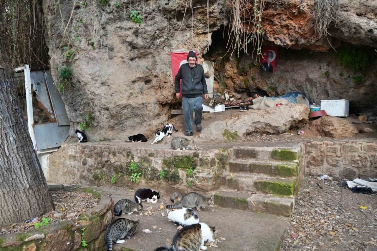 Antalya’nın falezlerindeki tarihi surlarda bulunan bir oyukta 4 yıldır hayatını sürdüren 63 yaşındaki Hüseyin Urlu, sade hayatı ve hayvan sevgisiyle dikkat çekiyor. İnsanlardan gördüğü kötülüklerden uzaklaşıp kendisini kedilere adadığını dile getiren Urlu, “Gideceğimiz yer iki metre toprak, iki metre kefen. Dünya senin olsa neye yarar? Başka bir şey götüremiyoruz ki” şeklinde konuştu.