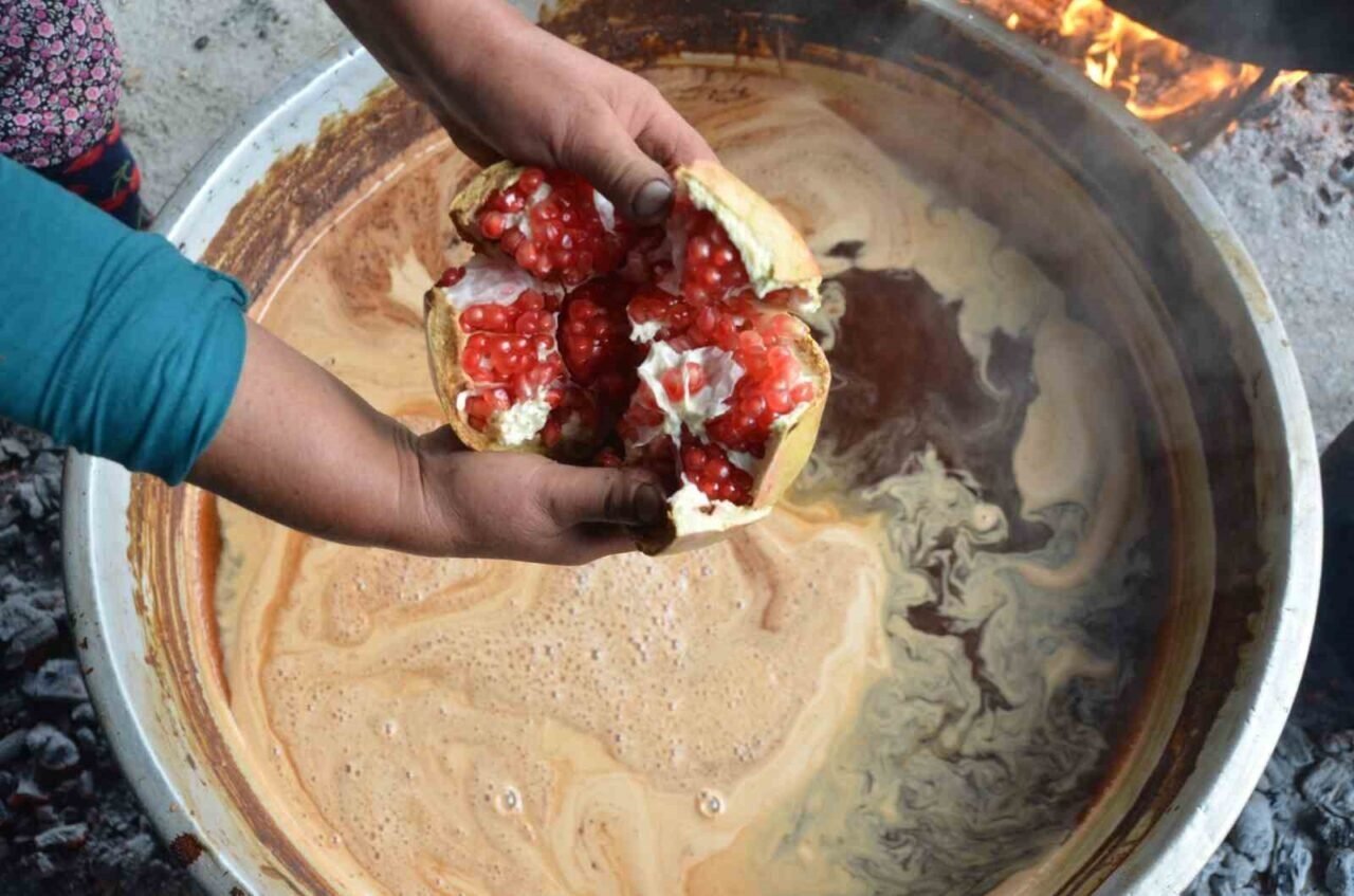 Elde edilen nar suyu süzüldükten sonra bakır tavalarda, odun ateşinde saatlerce kaynatılıyor. Koyulaşıncaya kadar kaynatılan nar suyu, soğutularak şişelere dolduruluyor ve sofralarda kullanılmak üzere raflarda yerini alıyor. Kadınlar, tüm bu üretim sürecini dayanışma usulüyle birlikte gerçekleştiriyor.