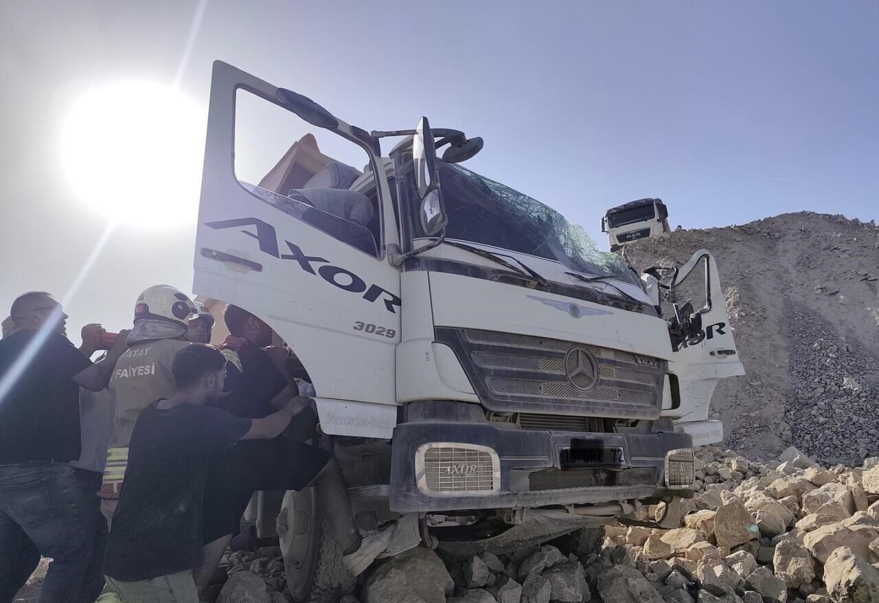 Hatay’da hafriyat döktüğü esnada devrilen kamyonunun sürücüsü araç içerisinde sıkışarak yaralandı.