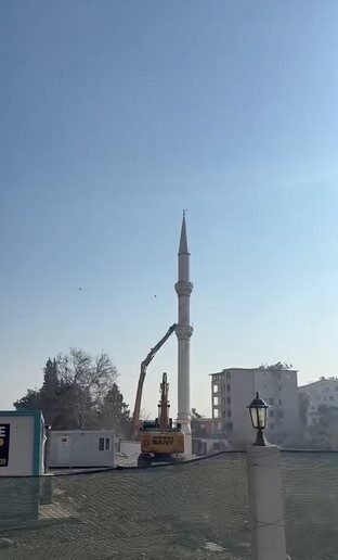 Kahramanmaraş merkezli depremlerde ağır hasar alan Hatay’da mahkeme süreci sona eren yapıların yıkım ve enkaz kaldırma çalışmaları aralıksız sürüyor. Kırıkhan ilçesi Cumhuriyet Mahallesi’nde bulunan ağır hasarlı olan caminin minaresi iş makinesi ile kontrollü olarak yıkıldı. Kas-ı Arifan Camii’nin minaresinin yıkılma anı kameralara anbean yansıdı. Minarenin yıkımı esnasından herhangi bir olumsuzluk yaşanmadı.