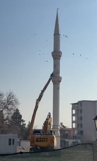 Hasarlı minare iş makinesinin dokunuşuyla yerle bir oldu