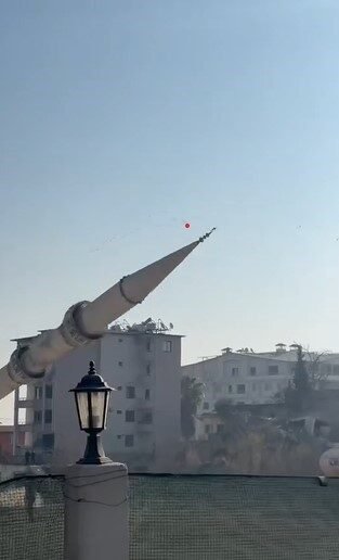 Hatay’ın Kırıkhan ilçesinde ağır hasarlı olan caminin minaresinin yıkılma anı kameraya yansıdı.