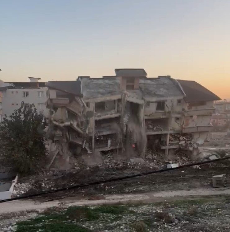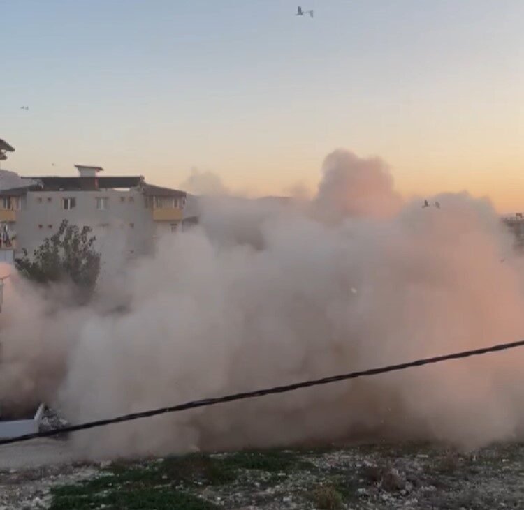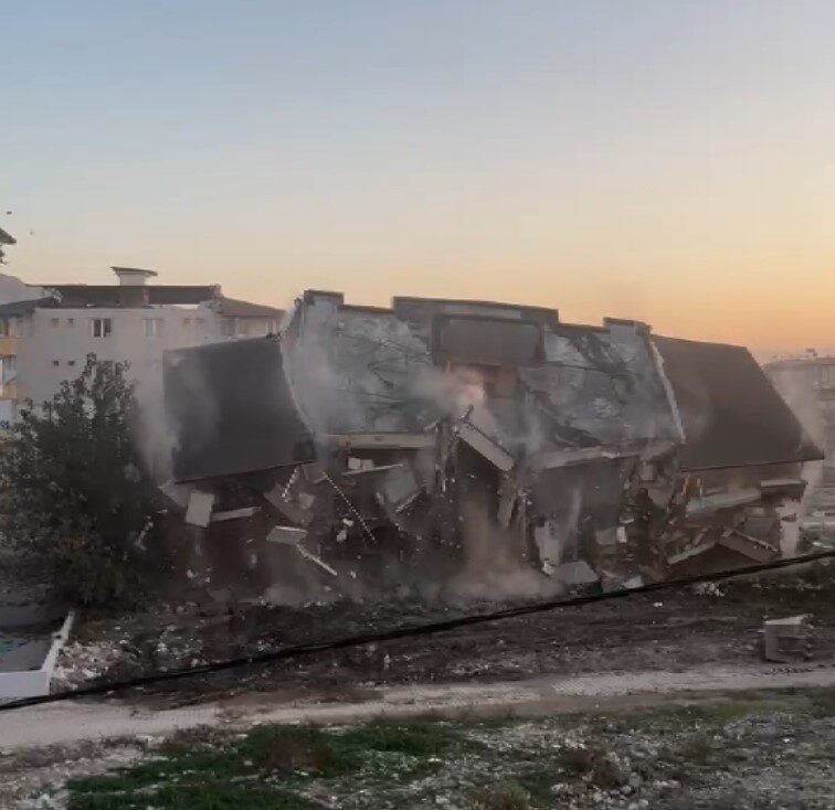 Hatay’ın Antakya ilçesinde 5 katlı binanın iş makinesiyle kontrollü olarak yıkıldığı anlar kameraya yansıdı.