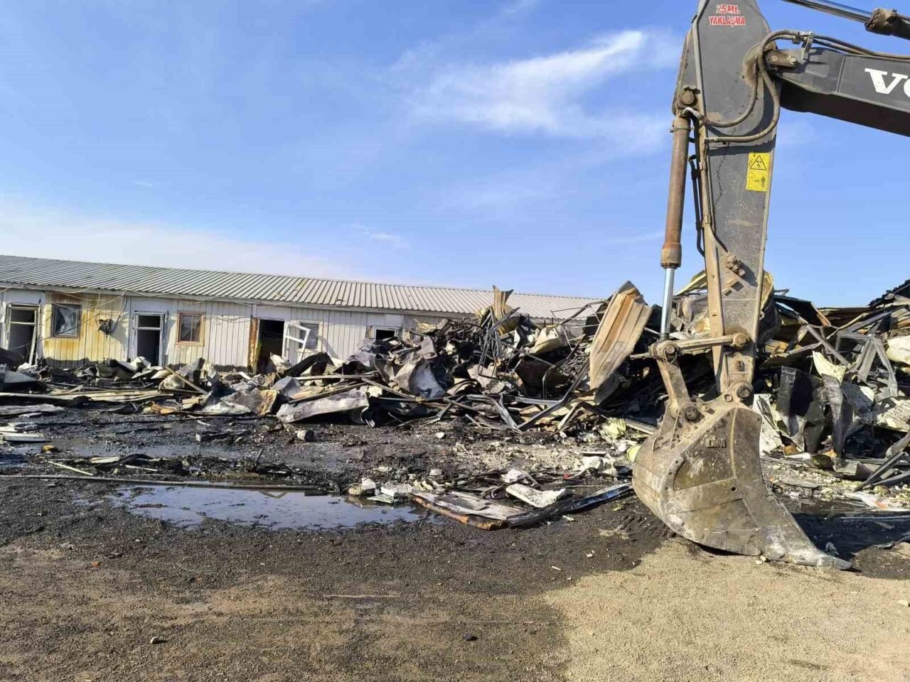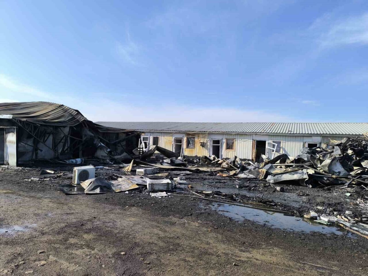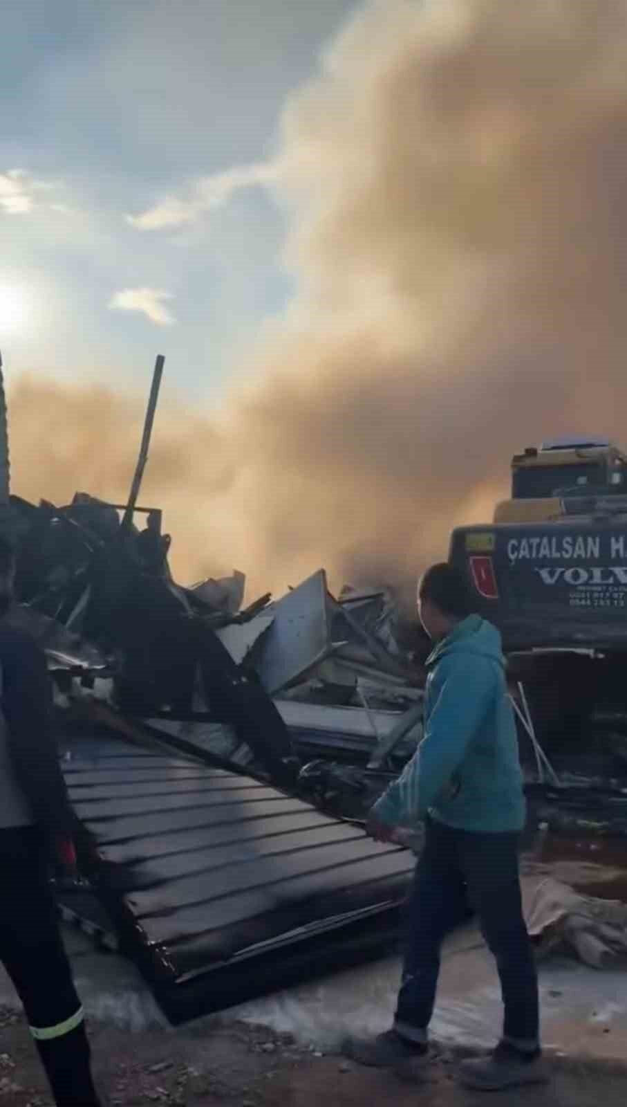 Hatay’da alevlere teslim olan şantiye alanındaki konteyner yatakhane kullanılmaz hale geldi.