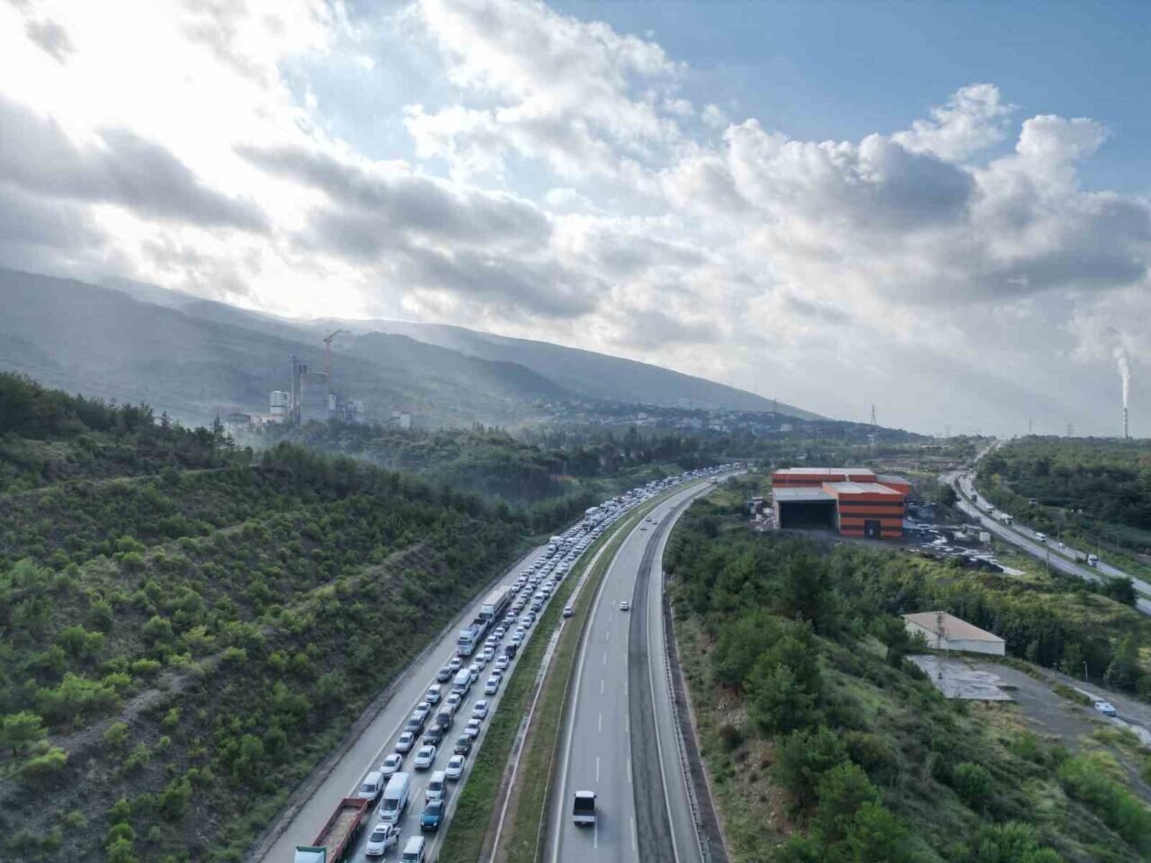 Hatay’da heyelan nedeniyle kapanan Toprakkale-İskenderun Otoyolu’nda oluşan kilometrelerce uzunluğundaki araç kuyruğu dron ile havadan görüntülendi.
