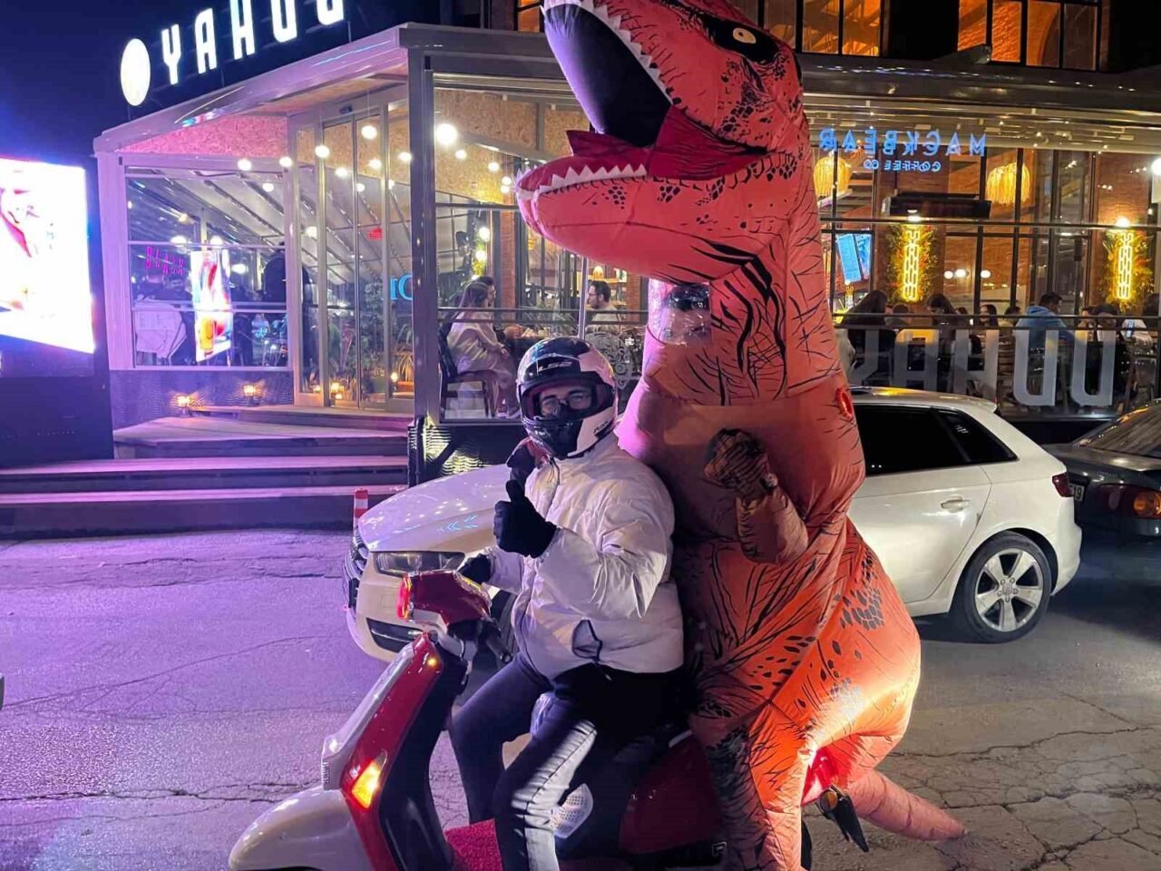 Başa’nın dinozor kostümüyle sokaklarda dolaşması, şehirde kısa sürede gündem olurken, olayın en ilginç anlarından biri polis ekiplerinin dinozorla karşılaşması oldu. Geçtiğimiz gün kaldırımda kostümüyle yürüyen Başa’yı durduran polisler, GBT sorgusu yaptı. Kimlik kontrolü sırasında yaşanan anlar, hem polisleri hem de çevredeki vatandaşları güldürdü.