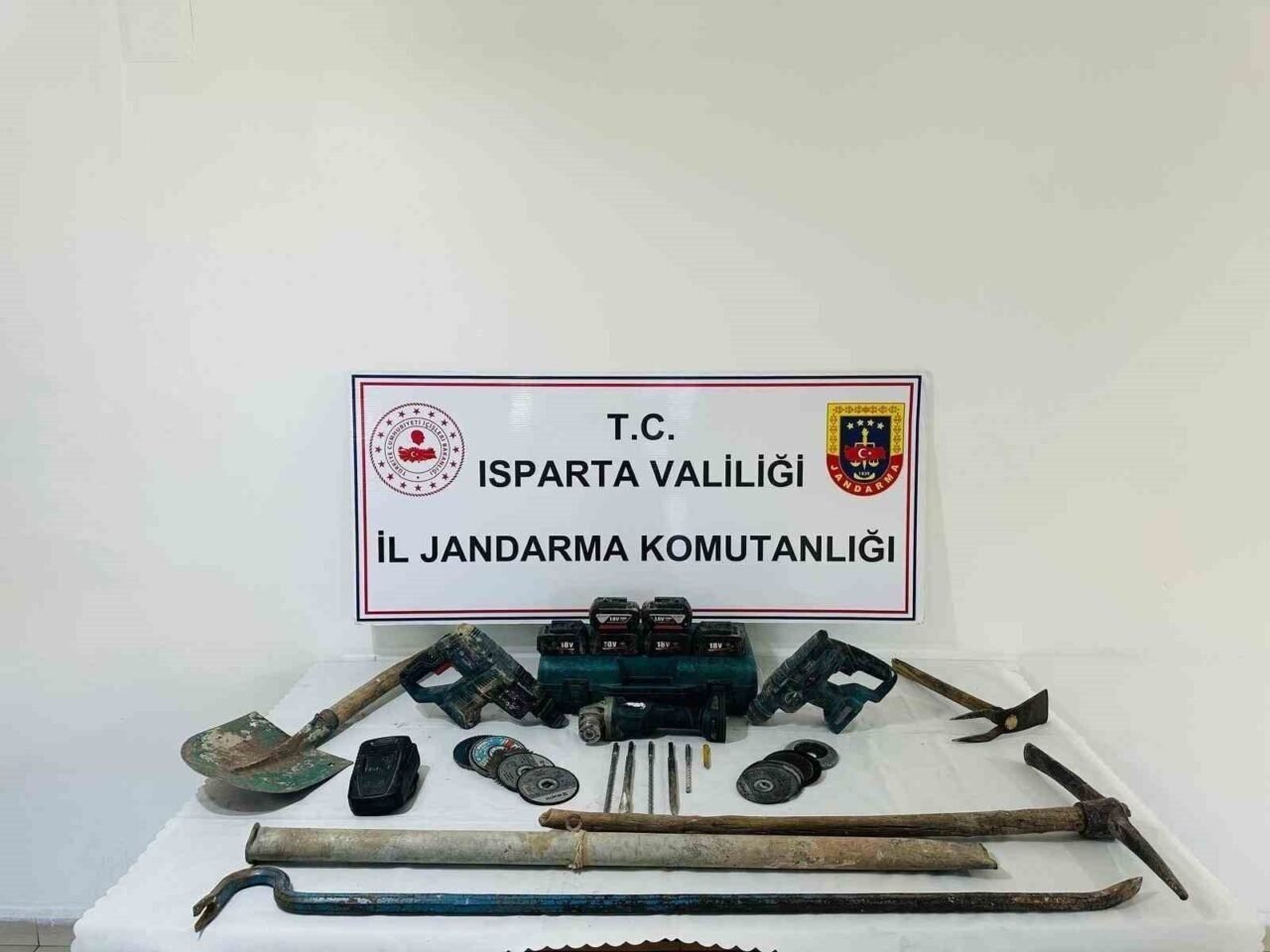 Kazı alanında yapılan aramalarda 2 adet kırıcı hilti, 1 adet spiral makinası, 6 adet hilti bataryası, 1 adet batarya şarj cihazı, 6 adet hilti ucu, 14 adet spiral taşı, 1 adet demir murç, 1 adet kürek, 1 adet kazma, 1 adet el çapası, 1 adet demir boru ve 1 adet kova ele geçirildi. Malzemelere el konulurken, şüpheliler hakkında Cumhuriyet Savcısının talimatı doğrultusunda adli işlemlere başlandı.