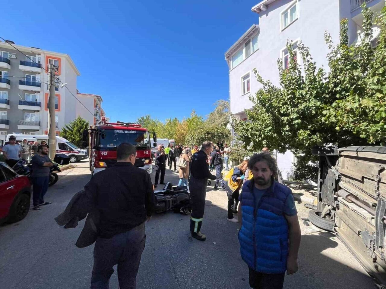 Isparta’da iki otomobil ve motosikletin karıştığı kazada 5 kişi yaralandı. Yan yatan otomobilde sıkışan yaralılar, itfaiye ekiplerince kurtarıldı.