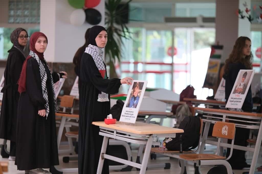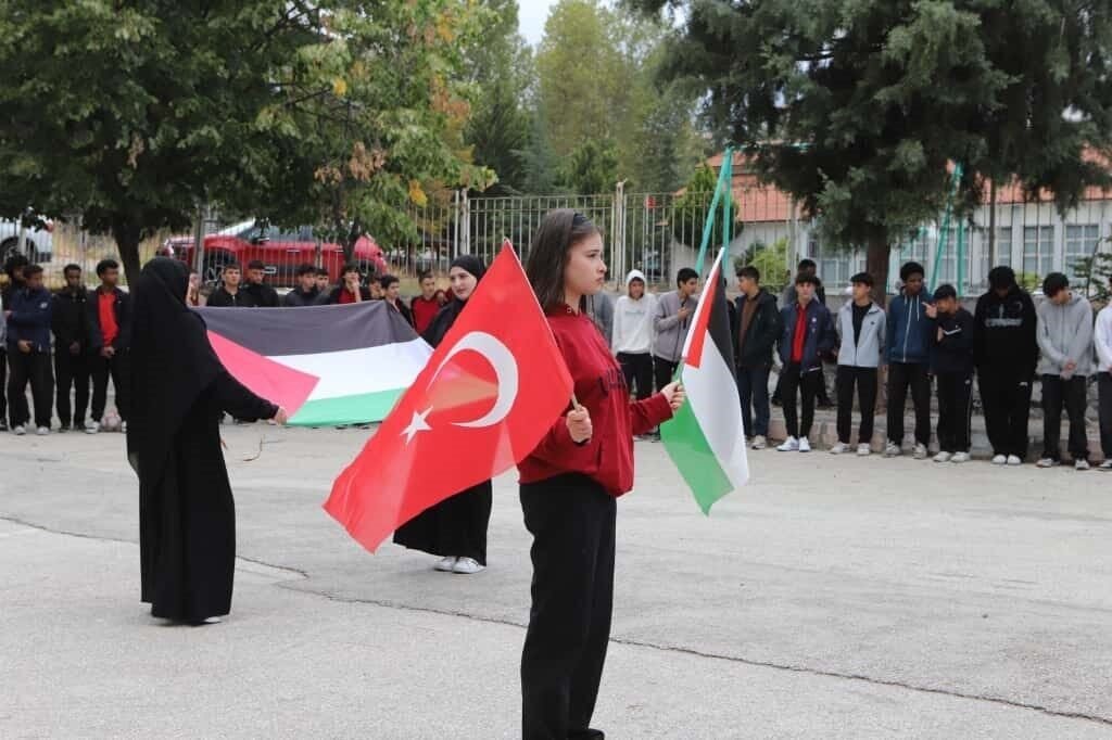 İl Millî Eğitim Müdürü Recai Ocak da gerçekleştirilen programa katılarak öğrencilerle birlikte farkındalık çalışmalarına destek verdi. Etkinlikler kapsamında öğrenciler tarafından afişler hazırlandı, şiirler okundu, dualar edildi, ayrıca resim çalışmaları ve tematik pano uygulamalarıyla Filistin’de yaşananlara dikkat çekildi. Etkinliklerin en anlamlı anlarından biri ise yaklaşık 100 öğrencinin oluşturduğu “Gazze” yazılı koreografi oldu. Dron ile görüntülenen bu anlamlı koreografiye, ellerinde Filistin bayraklarıyla katılan öğrenciler eşlik etti. Bazı öğrenciler Gazze’deki çocuklar için resimler çizerken, bazıları da barış ve dayanışma mesajları içeren sözlerle duygularını ifade etti. Eğitim camiası, mazlum coğrafyalarda yaşanan acılara duyarsız kalmayarak, çocukların barış içinde yaşayabileceği bir dünya için birlik mesajı verdi.