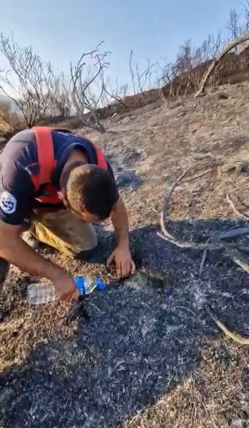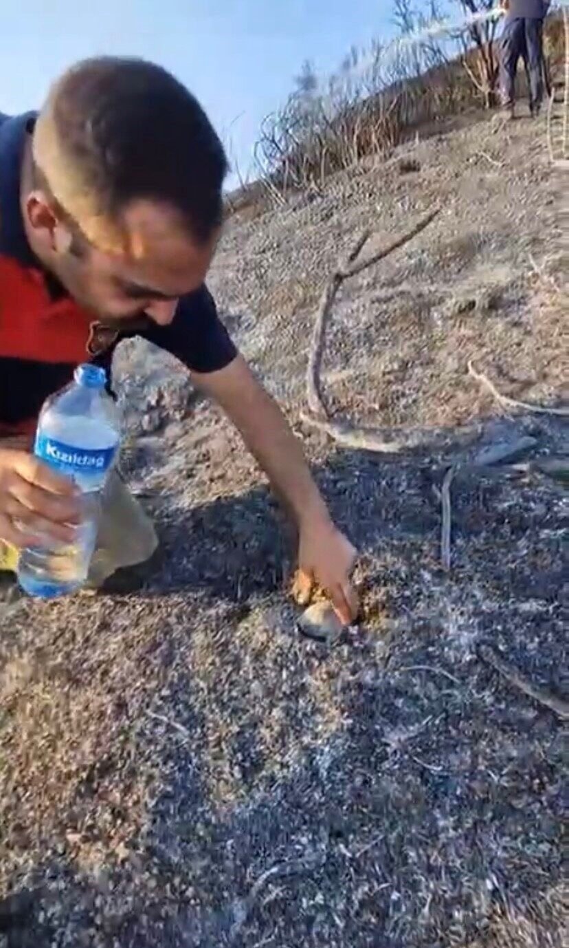 Hatay’ın Defne ilçesinde çıkan yangında alevler arasında mahsur kalan kaplumbağaya itfaiye personelinin can suyu verdiği anlar yürekleri ısıttı.