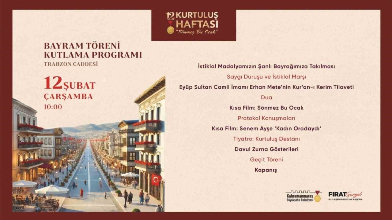 Kurtuluşun yıl dönümü olan 12 Şubat Çarşamba günü, Trabzon Caddesi’nde gerçekleştirilecek törenlerle kutlanacak. Saat 10.00’da başlayacak etkinlikler kapsamında Kur’an-ı Kerim Tilaveti, kısa film gösterimi, protokol konuşmaları, tiyatro gösterisi ve geleneksel geçit töreni yapılacak. Bu etkinliklerle Kahramanmaraş’ın bağımsızlık mücadelesi ve milli ruhu yeniden yaşatılacak.