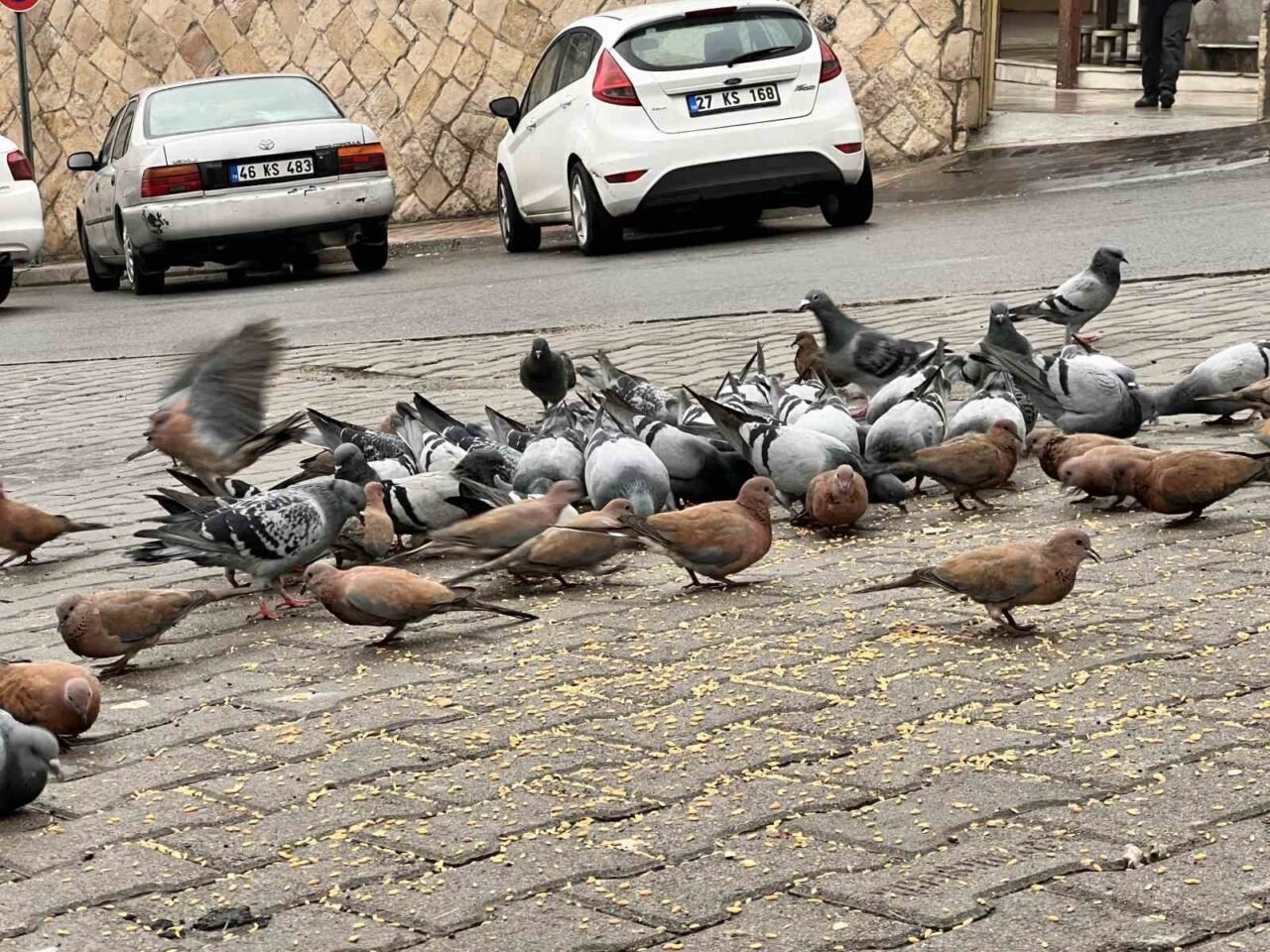 Kahramanmaraşlı esnaf depremde hasar alan cami önündeki güvercinleri her gün yemliyor
