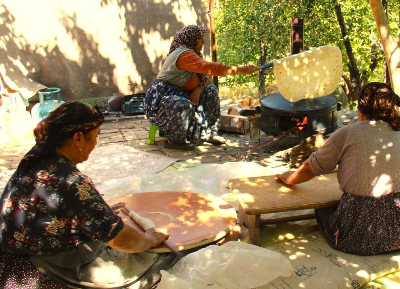 Ekmek pişiren Ayşe Gören, “Yaklaşan kış aylarına hazırlığımız devam ediyor. Bunlardan biri olan yufka (açık) ekmeğimizi yapıyoruz. Mahallenin kadınları kış gelmeden toplanıp, imece usulü birbirimize yardım ederek ekmeğimizi yapıyoruz. Bu komşular arasında dayanışmanın ve beraberliğin en güzel örneğidir” dedi.