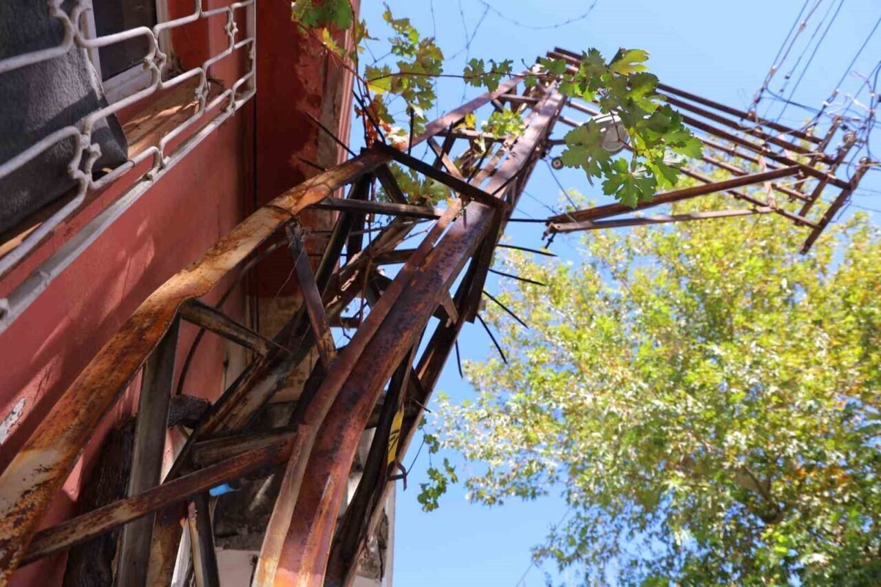 Kahramanmaraş’ta bir kamyonun çarpması sonucu eğik kalan demir elektrik direği aylardır tehlike oluşturuyor.