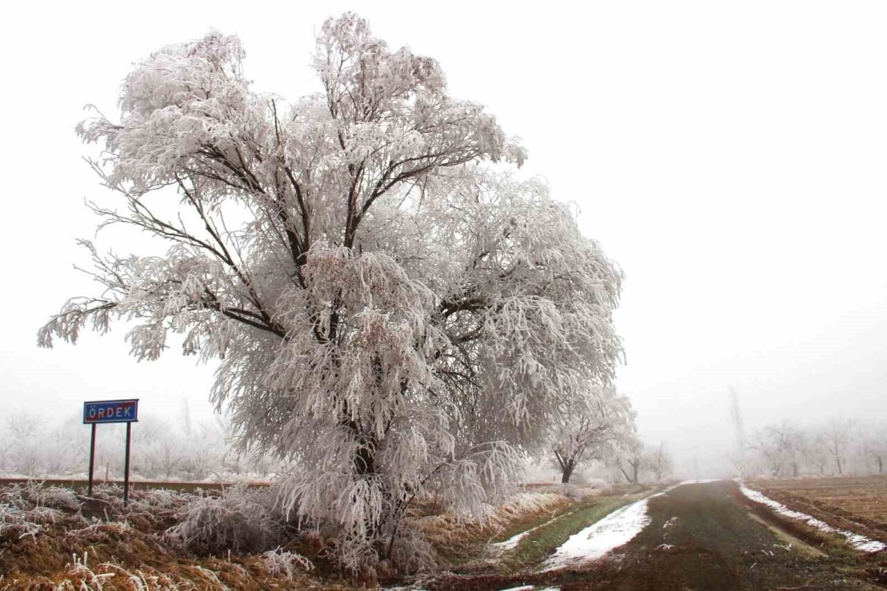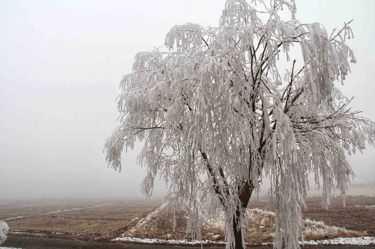 Kahramanmaraş’ta kırağıdan dolayı ağaçlar beyaza büründü.