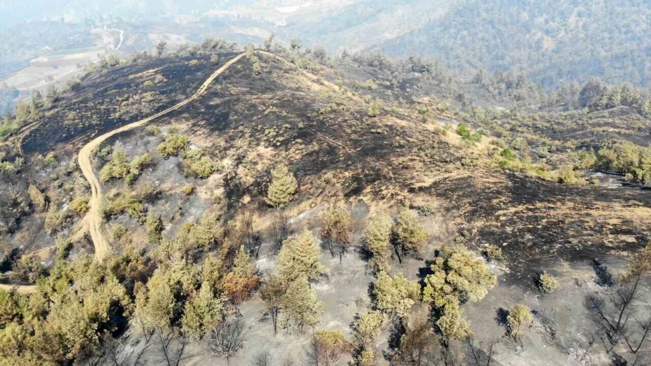 Yangının etkili olduğu ormanlık alandan yükselen dumanlar dron ile görüntülendi. Sarp ve ormanlık alandaki duman yoğunluğu dikkat çekti.