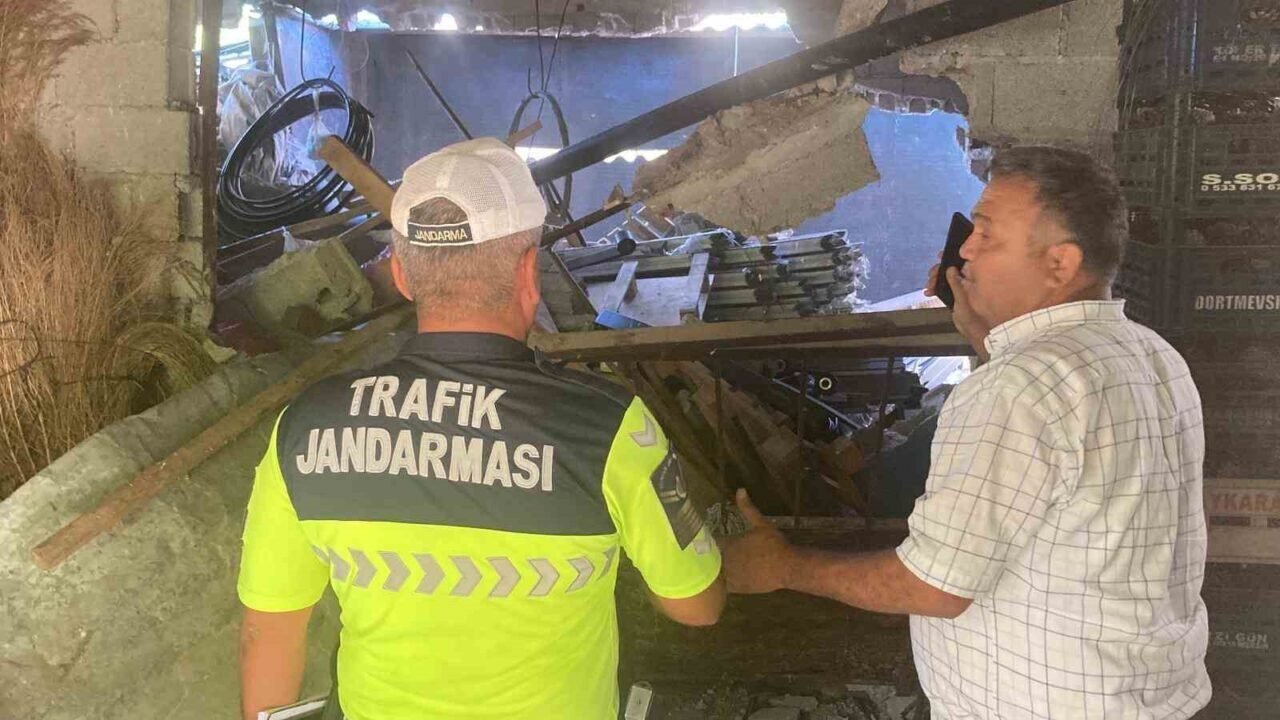 Mersin’in Erdemli ilçesinde hızla gelen nakliye kamyoneti virajı alamayarak iki evin arasındaki depoya girdi. Araçta sıkışan 2 yaralı iş makinesinin yardımı ve itfaiye ekiplerinin çalışmasıyla kurtarıldı.