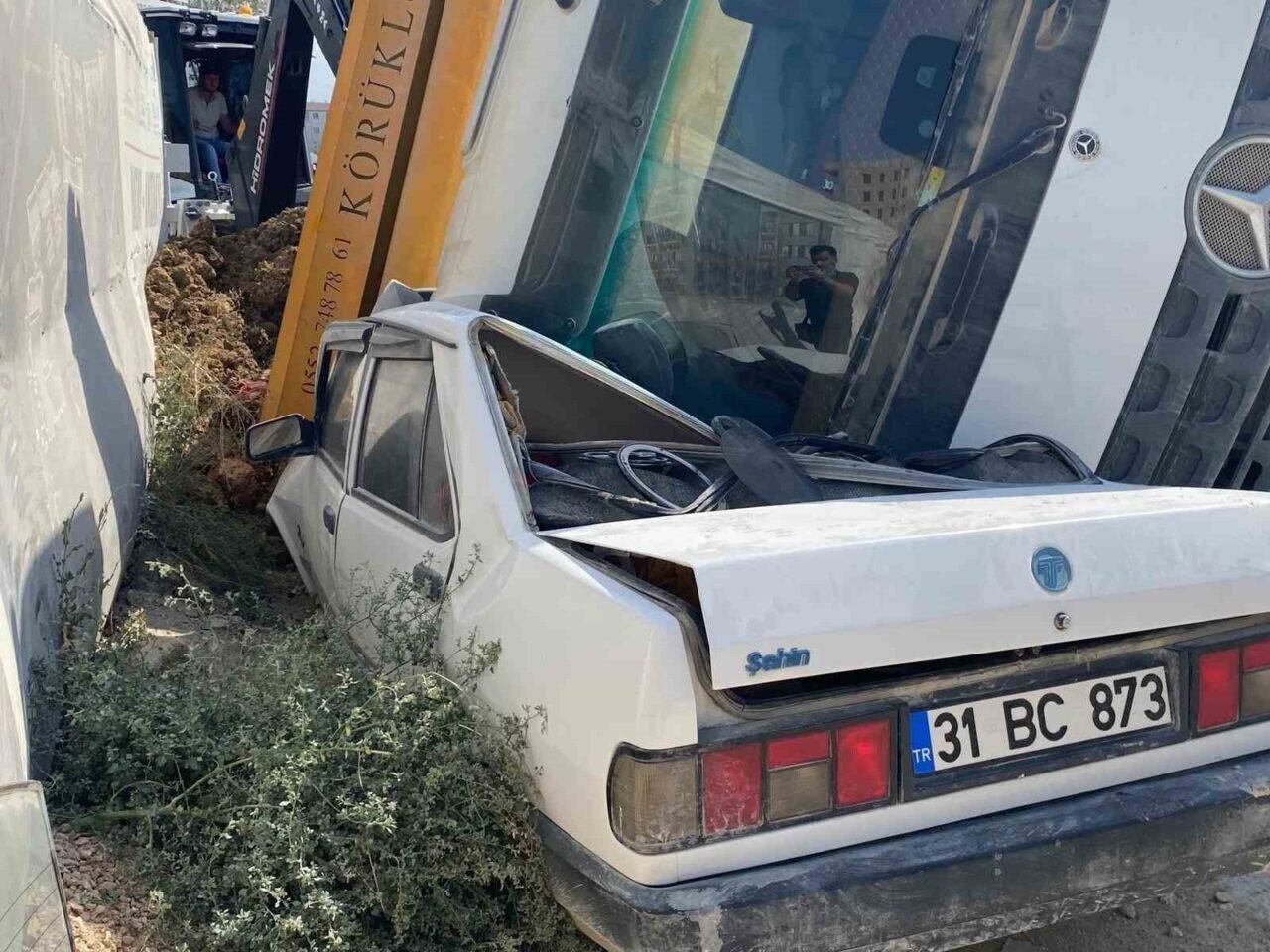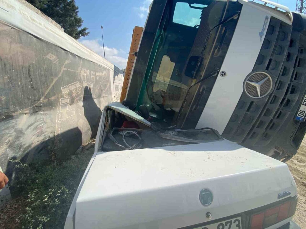 Hatay’da şantiyede içerisinde sürücüsünün kontrolü kaybettiği toprak yüklü hafriyat kamyonu, park halindeki Tofaş aracın üzerine devrildi. Kaza esnasında otomobilde kimsenin olmaması faciayı önledi.