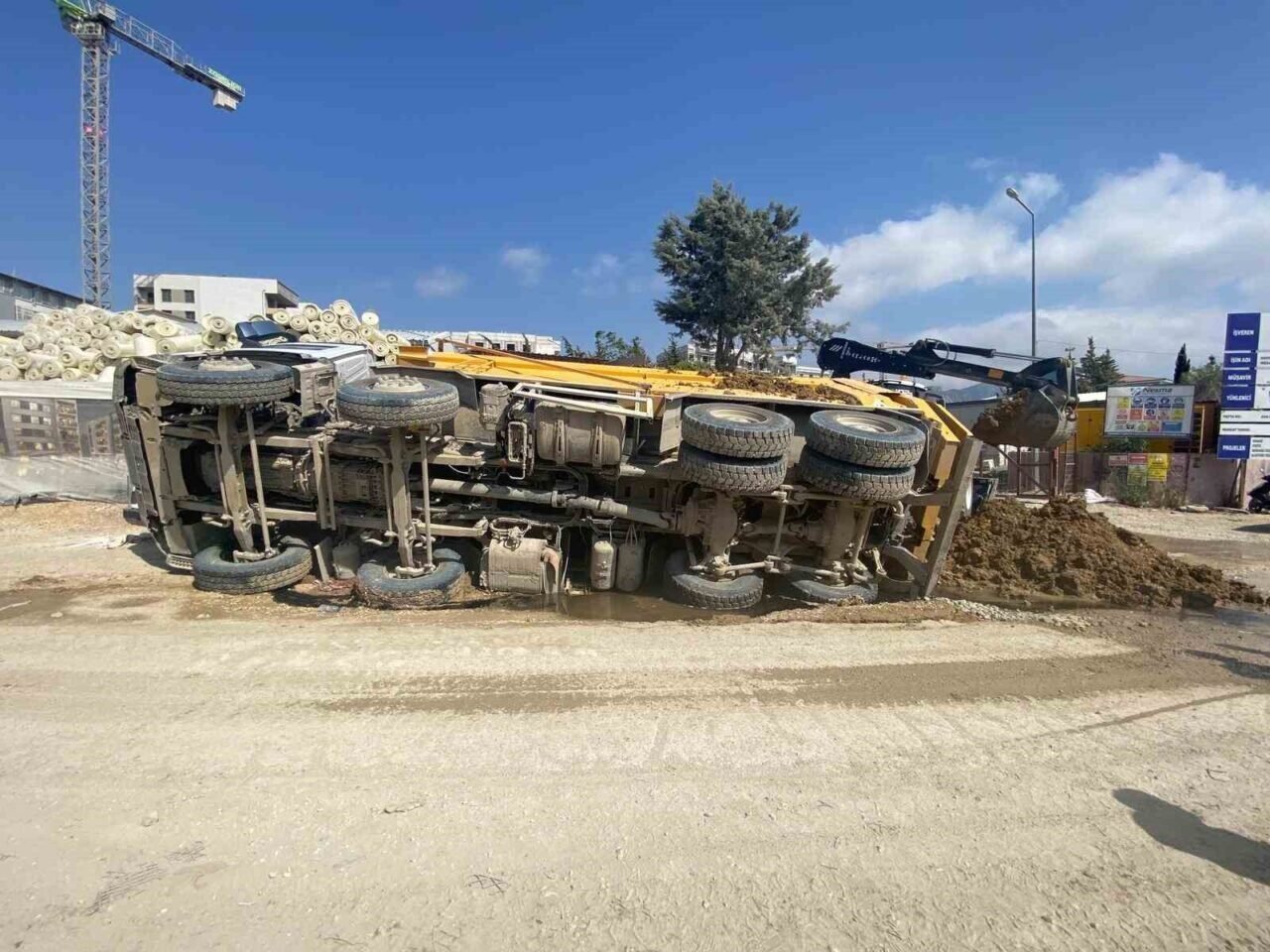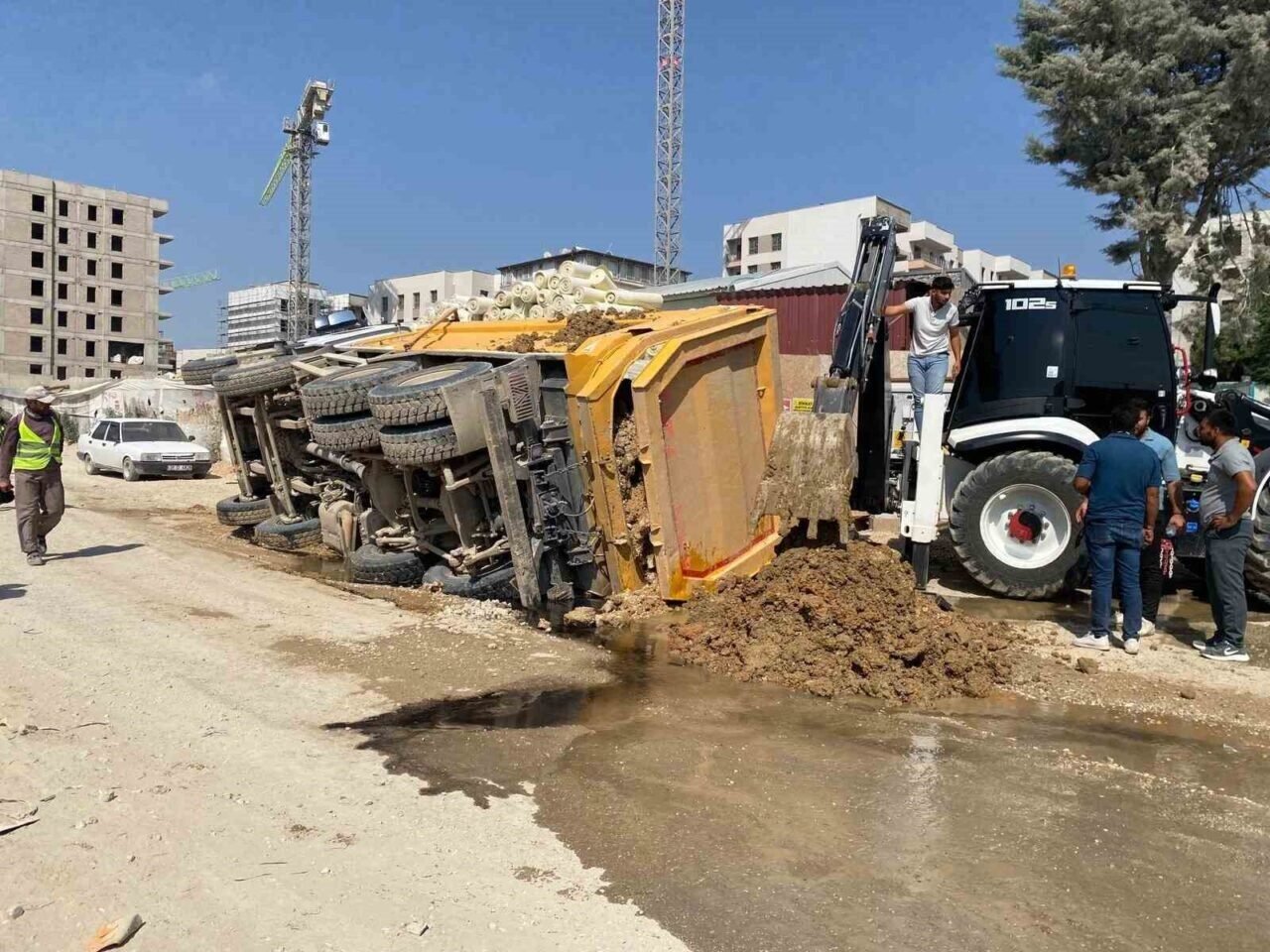 Kaza, Defne ilçesi Çekmece Mahallesi şantiye alanında yaşandı. Şantiye içerisinde seyir halindeki 06 FBY 351 plakalı Mercedes marka toprak yüklü kamyon, park halindeki 31 BC 873 plakalı Tofaş marka otomobilin üzerine devrildi. Kamyonun üzerine devrildiği otomobil hurda yığınına dönerek kullanılamaz hale geldi. Kamyonun üzerine devrildiği sırada otomobilde kimsenin olmaması muhtemel bir faciayı önledi.