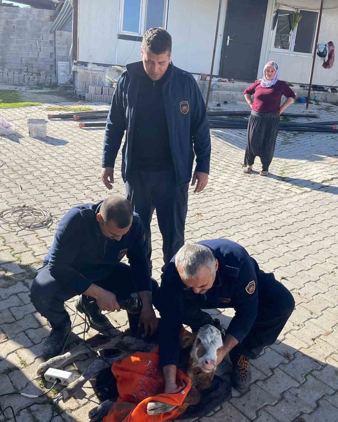 Hatay’da hayvancılık yapan vatandaşın otlaması için bahçeye bıraktığı buzağı kanalizasyon borusuna sıkışarak mahsur kalınca yardıma itfaiye ekipleri yetişti.