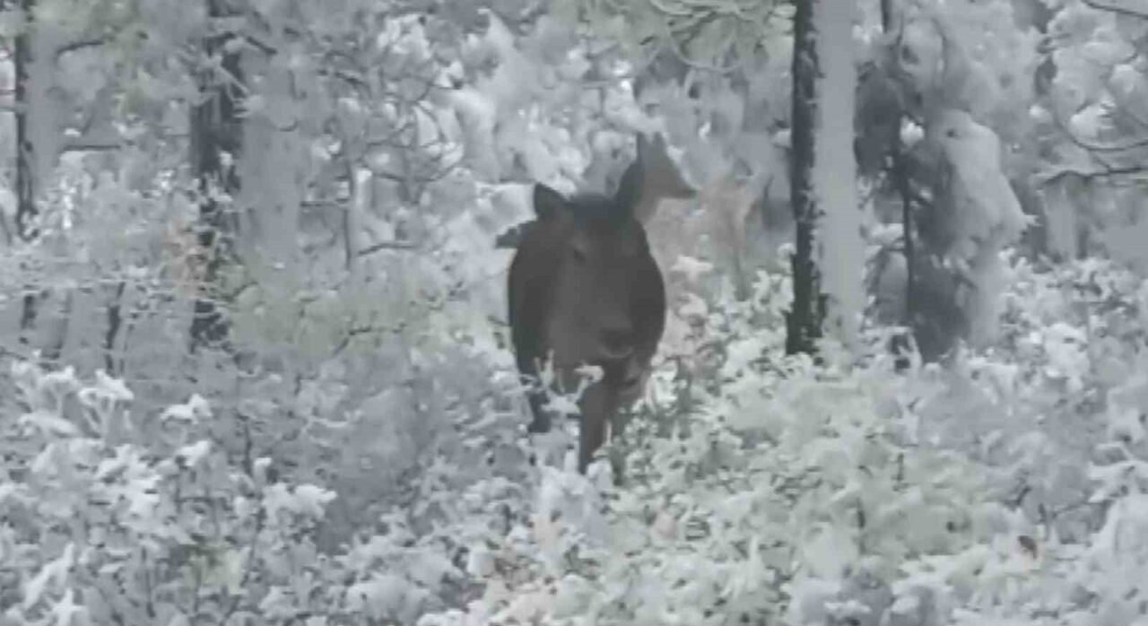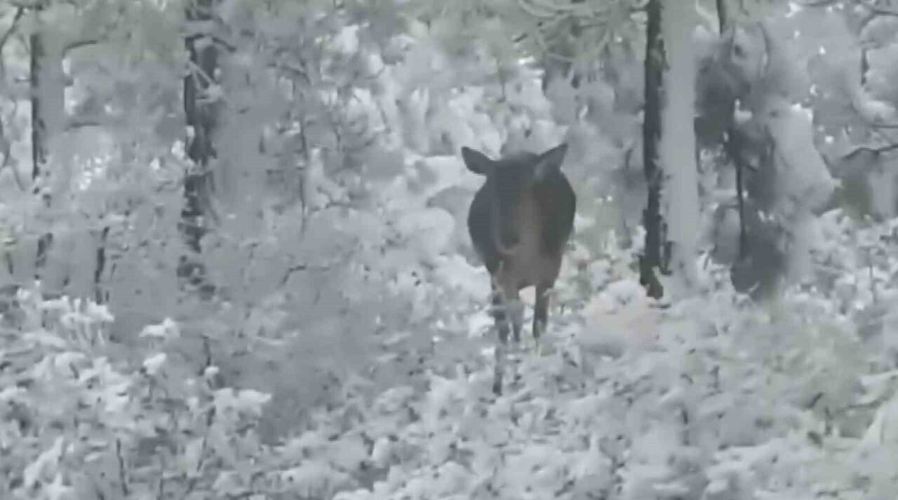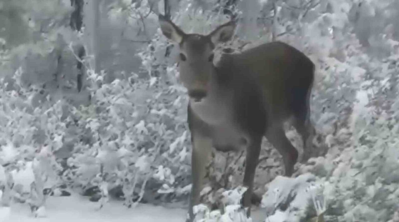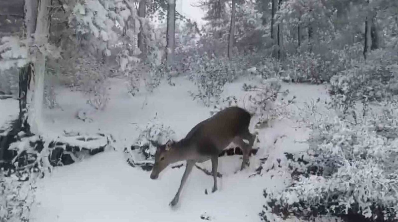Çarşamba günü kentte etkisini gösteren yoğun kar yağışı sonrası beyaza bürünen Eşeler Yaylası’nda yemek arayan kızıl geyikler yol kenarına inerek bölgeden geçen vatandaşlara hem kendilerini sevdiriyor hem de vatandaşların verdiği meyvelerle karınlarını doyuruyor.